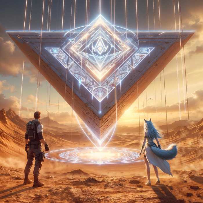 И тут мы увидели его. Из-за скалистого хребта показалось огромное сооружение, похожее на перевёрнутую пирамиду, висящую в воздухе над землёй. Его нижняя часть — острие пирамиды — почти касалась земли, создавая иллюзию, что вся конструкция вот-вот рухнет. Но она держалась, поддерживаемая невидимыми силами.