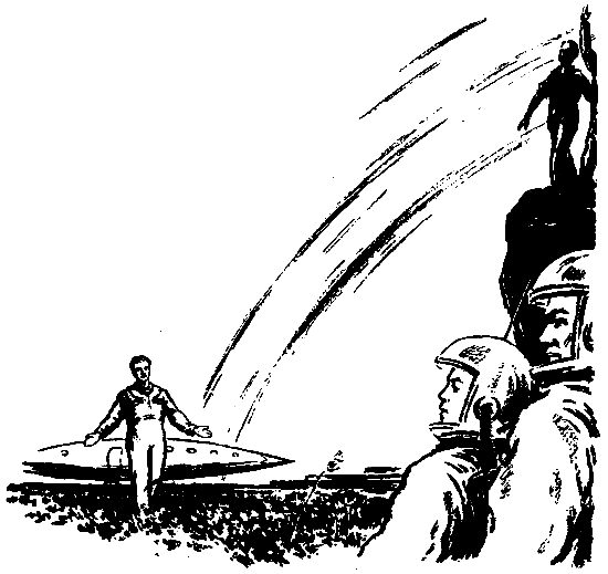 Часть белой обшивки откинулась, открывая вход в аппарат, и по ступенькам трапа на землю сбежал высокий темноволосый человек в светлом комбинезоне… Обыкновенный человек… Широко улыбаясь смуглым скуластым лицом, землянин смело подошел к пришельцам и, протянув обе руки вперед, молча остановился. Он ждал, что заговорят прилетевшие.
