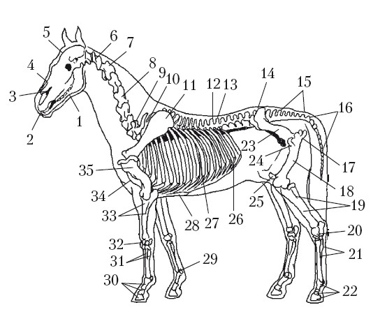 Скелет лошади: 1 – нижняя челюсть; 2 – резцовая кость; 3 – верхняя челюсть; 4 – носовая кость; 5 – лобная кость; 6 – атлант; 7 – эспистрофей; 8 – четвертый шейный позвонок; 9 – седьмой шейный позвонок; 10 – первый грудной позвонок; 11 – лопатка; 12 – последний грудной позвонок; 13 – первый поясничный позвонок; 14 – последний поясничный позвонок; 15 – крестцовая кость; 16 – хвостовые позвонки; 17 – седалищная кость таза; 18 – бедренная кость; 19 – кости голени (большеберцовая и малоберцовая); 20 – кости заплюсны; 21 – кости плюсны (плюсневая и грифельные); 22 – фаланги пальца (путовая, венечная и копытовидная кости); 23 – подвздошная кость таза; 24 – лонная кость таза; 25 – коленная чашечка; 26 – реберные хрящи; 27 – ребра; 28 – мечевидный хрящ грудной кости; 29 – семсамовидные кости; 30 – фаланги пальца (путовая, венечная и копытовидная кости); 31 – кости пясти (пястная и грифельные); 32 – кости запястья; 33 – кости предплечья (лучевая и локтевая); 34 – грудная кость; 35 – плечевая кость
