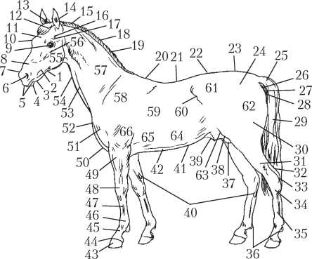 Стати лошади: 1 – подщечина; 2 – щека; 3 – подбородочная ямка; 4 – подбородок; 5 – губы; 6, 7 – ноздри; 8– переносица; 9 – глаз; 10 – надбровные дуги; 11 – лоб; 12 – челка; 13 – темя; 14 – уши; 15 – затылок; 16 – висок; 17 – надглазничная впадина; 18 – грива; 19 – гребень шеи; 20 – холка; 21 – спина; 22 – поясница; 23 – крестец; 24 – круп; 25 – репица хвоста; 26 – задний проход; 27 – промежность; 28 – седалищный бугор; 29 – хвост; 30 – ягодица; 31 – голень; 32 – ахиллово сухожилие; 33 – пятка; 34 – скакательный сустав; 35 – плюсна; 36 – щетки; 37 – мошонка; 38 – паховая область; 39 – крайняя плоть; 40 – каштаны; 41 – живот; 42 – нижний край грудной клетки (грудная кость); 43 – копыто; 44 – венчик; 45 – путо; 46– путовой сустав; 47 – пясть; 48 – запястье; 49 – подплечье; 50 – подгрудок; 51 – плечелопаточный бугор; 52 – грудь; 53 – яремный желоб; 54 – горло; 55 – ганаш; 56 – скуловой гребень; 57 – бок шеи; 58 – лопатка; 59 – боковая стенка грудной клетки; 60 – подвздох; 61 – маклок; 62 – бедро; 63 – колено; 64 – ложные ребра; 65 – локоть; 66 – плечо