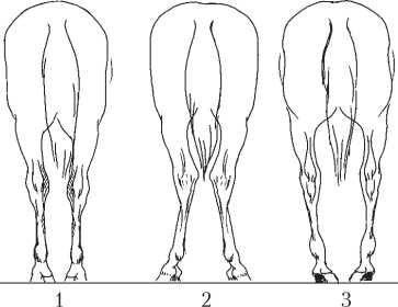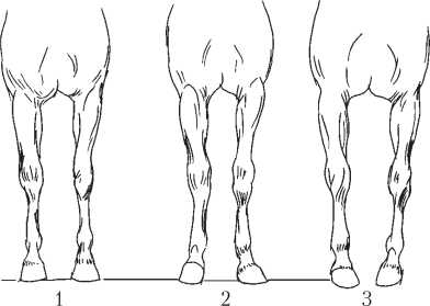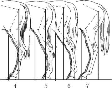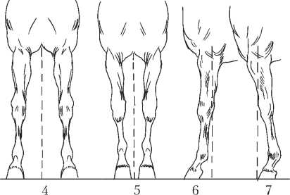 Постановка задних ног лошади: 1 – нормальная; 2 – Х-образная; 3 – О-образная; 4 – саблистая; 5 – прямая; 6 – отставленная; 7 – подставленная