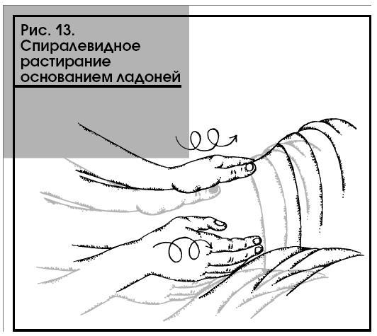 Спиралевидное растирание – вспомогательный прием, который выполняется основанием ладони или локтевым краем кисти, согнутой в кулак (рис. 13). При этом участвуют одна или обе руки попеременно и в зависимости от массируемой области. Можно использовать прием с отягощением одной кисти другой. Применяется при массаже спины, живота, груди, области таза, конечностей.