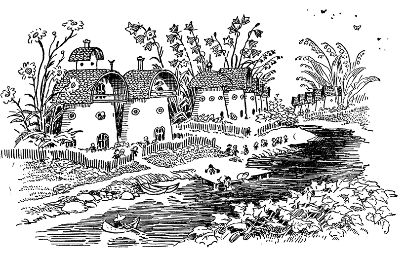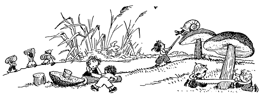 За рекой был лес. Коротышки делали из берёзовой коры лодочки, переплывали через реку и ходили в лес за ягодами, за грибами, за орехами. Собирать ягоды было трудно, потому что коротышки ведь были крошечные, а за орехами и вовсе приходилось лазить на высокий куст да ещё тащить с собой пилу. Ни один коротышка не смог бы сорвать орех руками – их надо было пилить пилой. Грибы тоже пилили пилой. Спилят гриб под самый корень, потом распилят его на части и тащат по кусочкам домой.