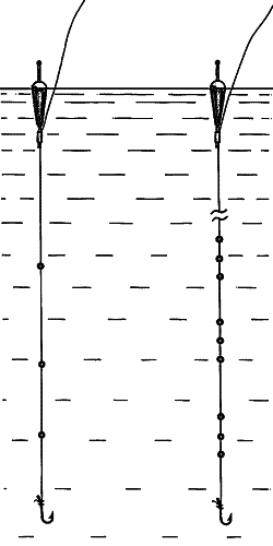свинцовые дробинки.В зависимости от глубины ловли для «глухой» оснастки применяют различное расположение грузил на леске. На небольшой глубине можно использовать одну группу грузил, на большой — две или даже три (рис. 4). В некоторых случаях грузила располагают по всей длине лески от поплавка до поводка. Иногда самое крупное грузило помещают под самым поплавком, а очень мелкие грузила — по убыванию массы равномерно по всей длине до поводка. При ловле в верхних слоях воды обходятся одним маленьким грузилом или тонущей насадкой, если ее нужно притопить.