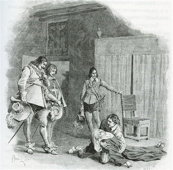 IIортос плакал, Арамис взглянул на небо с укором, Атос перекрестился. В это время в дверях показался человек, такой же бледный, как и все бывшие в комнате; осмотревшись, он увидел умершую Бонасьё н д’Артаньяна в обмороке. Он явился в минуту оцепенения, которая всегда следует за великими катастрофами.