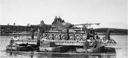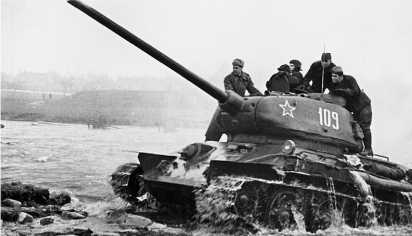 Танк Т-34-85 на переправе через Западную Двину. 1-й Прибалтийский фронт, июль 1944 года.