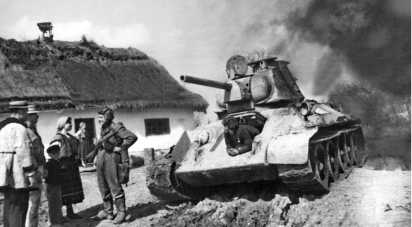 Танк Т-34 в освобожденной деревне на Буковине. 1-й Украинский фронт, 1944 год.