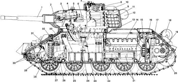 1 — пушка ЗИС-С-53; 2 — бронемаска; 3 — телескопический прицел TШ-16; 4 — подъемный механизм пушки; 5 — прибор наблюдения МК-4 заряжающего; 6 — неподвижное ограждение пушки; 7 — прибор наблюдения МК-4 командира; 8 — стеклоблок; 9 — откидное ограждение (гильзоулавливатель); 10 — бронеколпак вентилятора; 11 — стеллажная боеукладка в нише башни; 12 — укрывочный брезент; 13 — хомутиковая укладка на два артвыстрела; 14 — двигатель; 15 — главный фрикцион; 16 — воздухоочиститель «Мультициклон»; 17 — стартер; 18 — дымовая шашка БДШ; 19 —