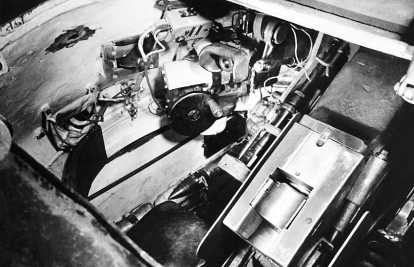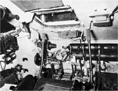Отделение управления танка Т-34. Место механика-водителя. Черный цилиндр слева вверху — уравновешивающий механизм крышки люка. Справа от люка, над баллонами со сжатым воздухом — аппарат ТПУ.