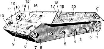1 — картер бортовой передачи; 2 — отбойный кулак пальцев гусеницы; 3 — стойка ограничителя балансира; 4 — кронштейн упора балансира; 5 — вырез для цапфы балансира; 6 — отверстие для оси балансира; 7 — кронштейн кривошипа направляющего колеса; 8 — броневая пробка над хвостовиком червяка механизма натяжения гусеницы; 9 — балка носовой части корпуса; 10 — буксирный крюк; 11— защелка буксирного крюка; 12 — бонки для крепления запасных траков; 13, 16 — защитные планки; 14 — броневая защита пулемета; 15 — крышка люка механика-водителя; 17 — кронштейн фары; 18 — кронштейн сигнала; 19 — поручень; 20 — кронштейн пилы; 21 — кронштейны наружного топливного бака.