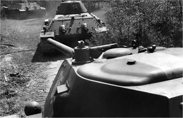 «Тридцатьчетверки» производства СТЗ. На переднем плане — машина со сварной башней и полностью съемным кормовым листом, крепившимся на восьми болтах. Перед ней в колонне — танки с литыми башнями.