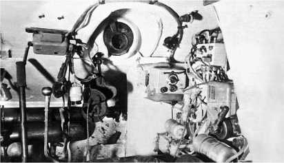 Вид внутрь башни танка Т-34 через башенный люк. Слева от казенника пушки Ф-34 хорошо различима трубка телескопического прицела ТМФД-7, выше ее — налобник и окуляр перископического прицела ПТ-4-7 и маховик поворотного механизма башни. Над последним размещен аппарат № 1 ТПУ командира танка. Левее и ниже аппарата ТПУ видна рамка бортового смотрового прибора, пользоваться которым, судя по снимку, командиру танка было весьма затруднительно.