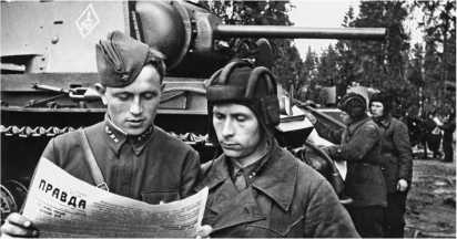 Командир танка КВ старший лейтенант В.Г. Бондуревский и старшина М.Е. Голенко за чтением газеты «Правда». Западный фронт, 116-я танковая бригада, апрель 1942 года.