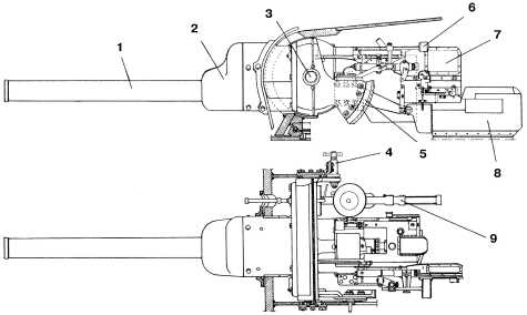 1 — ствол; 2 — маск-установка; 3 — цапфа; 4 — стопор походного положения пушки; 5 — зубчатый сектор подъемного механизма; 6 — налобник прицела; 7 — подушка; 8 — гильзоулавливатель; 9 — пулемет ДТ.