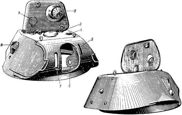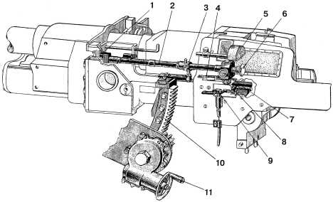 1 — чашечка; 2 — прицел; 3 — державки телескопа; 4 — линейка указателя отката; 5 — лобовой упор; 6 — наглазник; 7 — маховичок боковых поправок; 8 — маховичок углов прицеливания; 9 — рычаг спуска; 10 — сектор подъемного механизма; 11 — ручка маховичка.