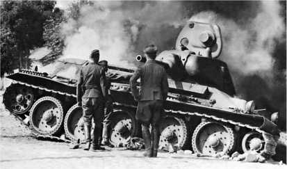 Немецкие солдаты осматривают подбитый танк Т-34. Лето 1941 года. Эта машина оснащена литой башней, что было редкостью — большая часть «тридцатьчетверок» довоенного выпуска, тем более ранних, с пушкой Л-11, имела сварные башни.