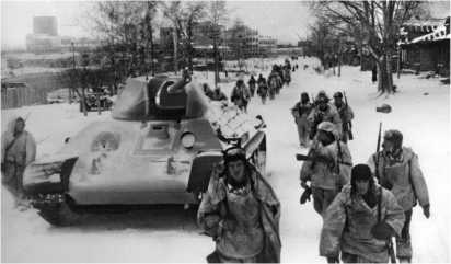 Советские войска вступают в освобожденный город Клин. Декабрь 1941 года.