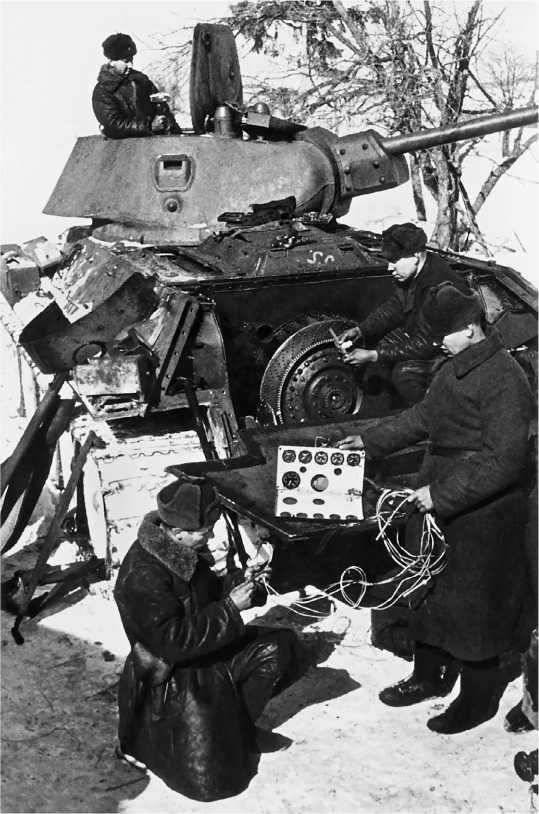 Ремонт танка Т-34 в полевых условиях. Западный фронт, ноябрь 1941 года.