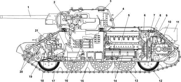 — пушка Ф-34; 2 — механизм вертикальной наводки; 3 — башенный вентилятор; 4 — заглушка отверстия для крепления приспособления проверки отката и наката компрессора пушки; 5 — двигатель; 6 — вентилятор; 7 — главный фрикцион; 8 — воздухоочиститель; 9 — стартер; 10 — коробка передач; 11 — наружный топливный бак; 12 — опорный каток с резиновым бандажом; 13 — опорный каток с внутренней амортизацией; 14 — аккумуляторы; 15 — кладка пушечных выстрелов на полу боевого отделения; 16 — сиденье командира; 17 — сиденье механика-водителя; 18 — рычаг управления; 19 — педаль главного фрикциона; 20 — баллоны для воздушного запуска; 21 — радиостанция.