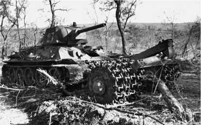 Т-34 с противоминным катковым тралом ПТ-3. Курская дуга, 1943 год.