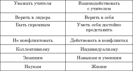 Вот чему и как учат в школах в странах с различными культурными традициями. Для наглядности подходы несколько гиперболизированы. Попробуйте сами догадаться, что характерно для Америки, а что для Азии, где подход ближе к восточному, а где к западному.