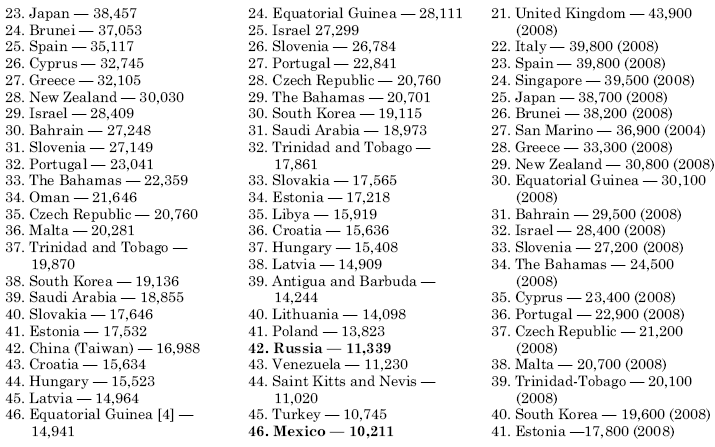 Обычно все же считается, что более адекватная, хотя и труднее подсчитываемая, характеристика – стоимость всех конечных продуктов и услуг, произведенных за год в стране, деленная на среднегодовое население: purchasing power parity (PPP). Этих цифр не приводим. Сюрпризов тут нет, у нас примерно те же места, что и по GDP.