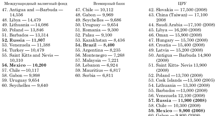 Проще всего сравнить ежегодный валовой продукт на душу населения (GDP – gross domestic product per capita),хотя это и не абсолютный критерий. Считают его по-разному, поэтому приведем данные нескольких центров. Есть флуктуации, данные по одним странам ненадежны, по другим – отсутствуют, но вполне можно выделить кластеры первого, «второго» и «третьего» мира чисто на основании GDP-2008, выраженного в американских долларах. Тенденция везде прослеживается, она ясна.