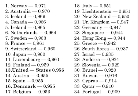Вот данные за 2009 год [38] . Даем только место страны, ее название и индекс.