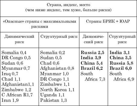 Самые опасные по уровню рисков страны (успокойтесь, России там нет, конечно) даны в левой половине таблицы. В правой части приведены страны БРИК. Они на самом деле очень разные, и риски там разные.