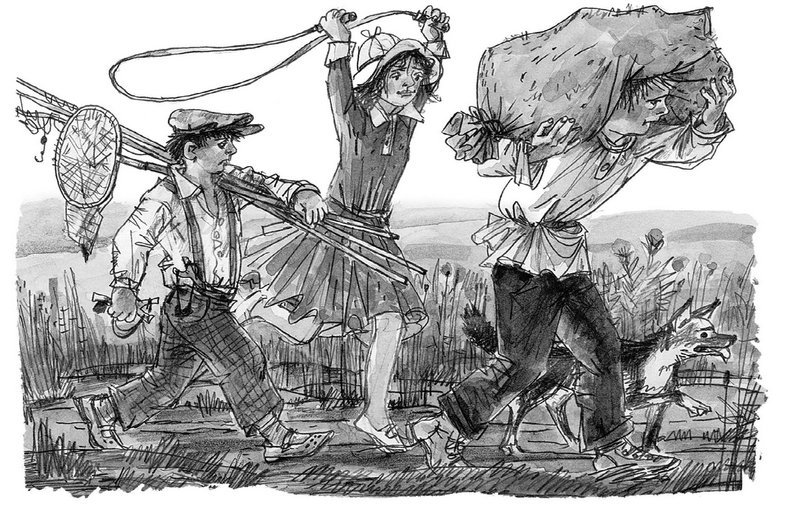 Впереди бежала Стёпкина собачка Тузик. За ней шёл Стёпка с громадным мешком на голове. За Стёпкой шла Лёля со скакалкой. И за Лёлей с тремя рогатками, сачком и удочкой шёл я.