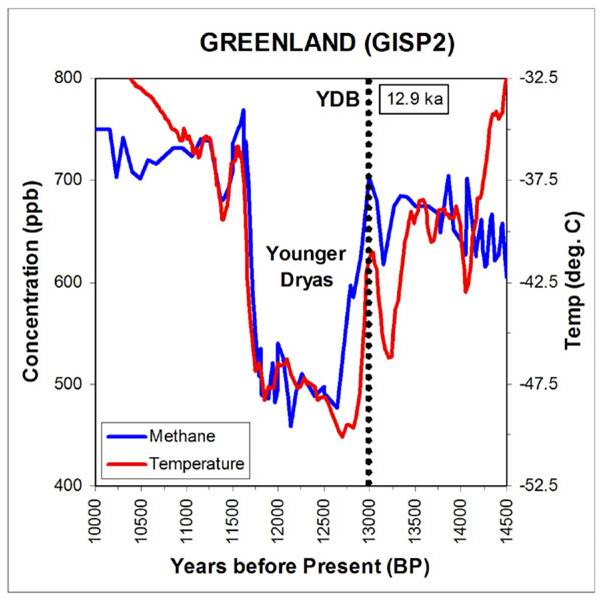 График среднегодовых температур (красный цвет) и содержания метана (синий цвет) в Гренландии. По горизонтальной оси: время (от настоящего слева направо). График из статьи YOUNGER DRYAS (YD) EXTINCTION By Sonia Fernandez, (Crater Explorer.ca 6 марта 2020)