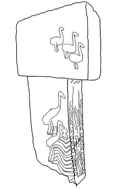 Эскиз столба 33 в Гобекли-Тепе, корпус D, показывающий сторону с парой высоких птиц. На другой стороне столба изображена лиса. Змеиные символы исходят от этих символов животных, их головы сходятся на узкой внутренней стороне колонны.(из статьи М.Свитмана [3])