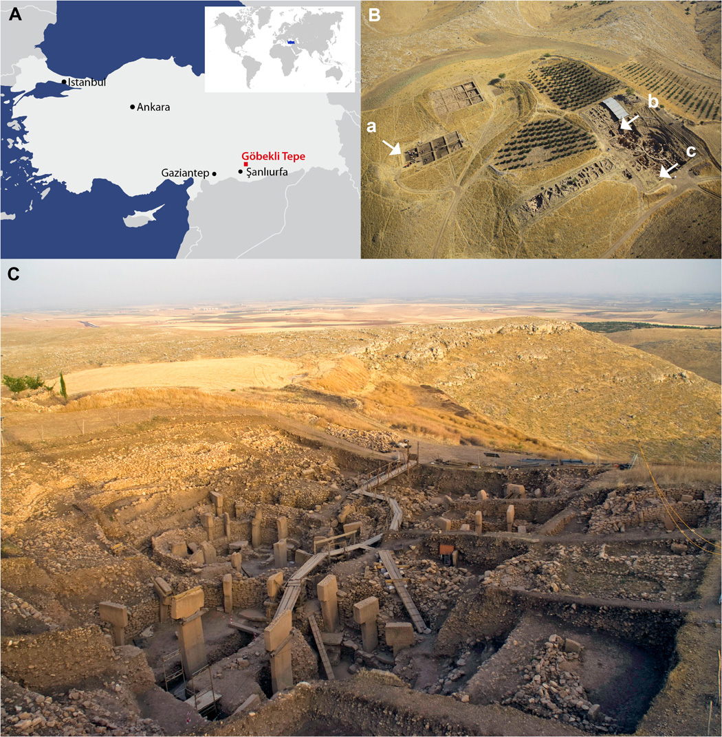 А) Расположение Гёбекли-Тепе на карте Турции; B) Схема раскопок в Гёбекли-Тепе, где отмечены находок черепов 1-3; С) Фото самого памятника, с Т-образными монолитами (коллаж из статьи А.Соколова «…культ обитателей Гёбеки Тепе», https://22century.ru/biology-and-biotechnology/52339 )