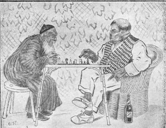 Это было рассчитаное пожертвование фигуры, но аксакал стал причитать, как плакальщица на похоронах, и судья, почуяв ловушку, остановился, стал думать и, выпив рюмку — вина, снова закурил сигару. Этот плачущий и стонущий тигр Абдурахман ходил, поджимая лапы, такими неслышными шагами по всей доске, что каждый данный момент у него была возможность начать атаку в трех или четырех местах. Но он все ждал и ждал, и, развивая всюду старые интриги, затевал новые. Это была не доска, а гарем эмира бухарского с государственным заговором. Фигуры шипели и угрожали, и интриги росли и росли.