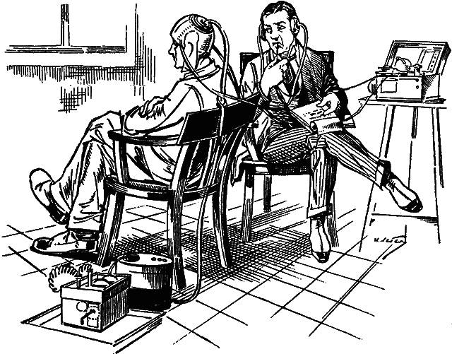 — Вам, вероятно, известно, синьор Минетти, что по последним научным изысканиям, наша нервная система и мозг являются трансформатором электромагнитных волн. Результат работы мозга — наша мысль — излучает особые электроволны. Надо только поймать их и произвести обратную трансформацию электроволн в мысли, в звучащие мысли, если хотите. Металлический колпак — приемник. Вот этот ящичек — усилитель электромагнитных колебаний, производимых мыслью, а вот этот ящичек — обратный трансформатор. Здесь электроволны оформляются в звукомысли. А вот это приемный телефон. Ясно, как молодой месяц, не правда ли?..