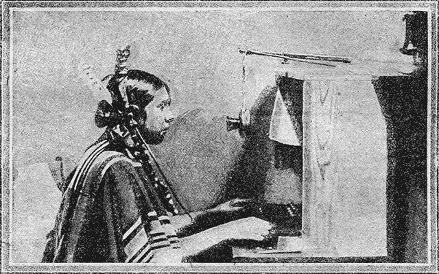 В йеллостоунском Национальном парке (Сев. — Ам. Соед. Штаты), в одном из отелей, есть служащая телеграфистка — чистокровная индианка. Вольные дети прерий, вытесненные из своих исконных территорий белыми, вынуждены зарабатывать кусок хлеба теми формами труда, какие предоставляет им современная цивилизация. Однако, и молодому поколению краснокожих трудно расстаться со своими традиционными костюмом и прической, и, как мы видим на фотографии, индианка-телеграфистка одета в свой национальный костюм, далеко не гармонирующий с изобретениями современной культуры.