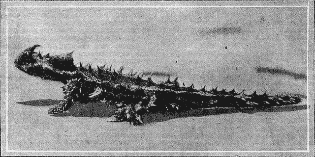 Только Австралия, страна диковинных явлений — бескрылых птиц, красного дождя, несущих яйца животных, — могла произвести на свет чудище, представленное на этом снимке. Безобидная ящерица, которой у нас не боятся даже дети, — там переделана природой в колючее страшилище. Ее даже тронуть нельзя, не вызвав уколами ее шипов серьезного воспалительного процесса.