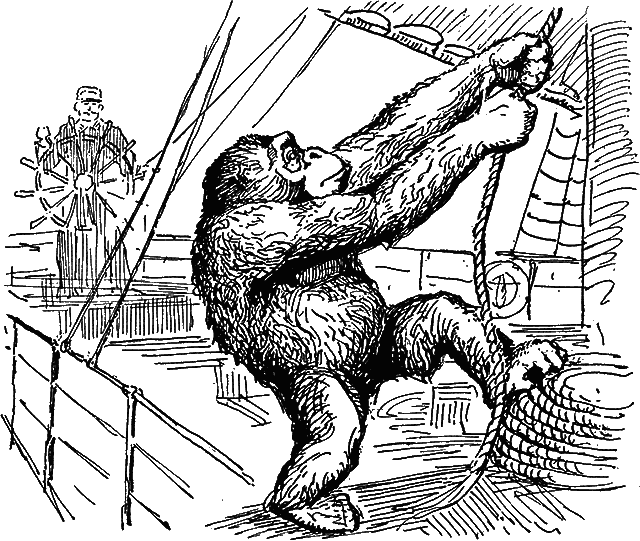 Горилла понюхала, подтащила цепи, вытянула жадные руки. Но Фург хорошо рассчитал. Ни еду, ни питье нельзя было достать. Тогда горилла, сильная, как десять матросов, принялась тянуть конец фала. Паруса поднялись и натянулись. Пока горилла ела, Фург заканчивал ее дело. Потом он заставил ее брасопить паруса, показав на бутылки с водой. Ветер свежел, паруса поднимались и вздувались один за другим. Бриг наклонился. Пять, семь, десять узлов. Вода шумела и пенилась. Фург держал руль. По мере надобности он вешал то с той, то с другой стороны мачты, на той или другой снасти, пищу и питье. Он следил за тем, чтобы его четверорукий матрос не пресытился.