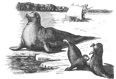 никогда не видавшего морских животных охотника — существо, похожее одновременно и на четвероногое и на рыбу. Ростом с человека, оно было все покрыто короткой светло-желтой шерстью. Короткая, маленькая по сравнению с туловищем морда с толстой верхней губой и щетинистыми усами, большие темные глаза, толстая шея, туловище, равномерно утончавшееся от плеч к хвосту. Животное упиралось в лед передними конечностями — не то лапами, не то толстыми плавниками. Задние ласты лежали вместе и напоминали издали рыбий хвост. Возле нерпы ползало два серебристо-серых щенка. Зверь лежал совершенно неподвижно, так что неопытного охотника взяло сомнение, жив ли он. Но в этот момент усатая морда широко зевнула. Животное повернулось боком к солнцу, прижав ласты к груди. Оно могло лежать часами, переваливаясь с боку на бок.Разглядев, наконец, нерпу и удовлетворив свое любопытство, Кузьма стал устраиваться, чтобы было удобно стрелять.