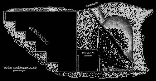 Приступили к тщательному обследованию склепа. Камень из входного отверстия вытащить было нельзя: его не пускали дверные косяки. В этом заключался секрет греческих погребальных построек. Дверной камень — огромную гладкую плиту — можно было задвинуть только изнутри. Спрашивается: кто же ее задвигал? Не покойники же? Искусный прием греков остался неизвестен. Когда исследователи попробовали протолкнуть камень внутрь, он не подался; бить сильнее не решались из опасения расколоть. Оставалось отверстие над дверью. Профессор заглянул в него. Наскоро был составлен план действий. Оказалось, что земной наплыв понижался от пролома к противоположной стене. Решено было расчистить пробитое отверстие и спустить в склеп сначала Лукина, а потом одного рабочего. Они должны были постараться проникнуть в небольшую камеру перед склепом и там обследовать изнутри плиту-дверь.