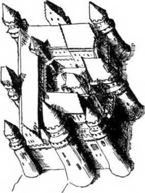 При возведении крепостей выбиралось место на высоком откосе над рекой или морем, служившим естественной защитой и позволявшим сберечь и материал, и силы для большего укрепления других сторон. Характер участка такой крепости обусловливал нередко ее неправильный план. Она окружалась со всех сторон широким рвом и высокими гладкими стенами, сложенными из огромных камней. Стены обычно оканчивались зубцами, за которыми осажденные могли прятаться, выливая на врагов горячую смолу. На углах крепости и по стенам стояли сторожевые башни цилиндрической формы. Они отстояли друг от друга не меньше чем на сорок метров, так как лишь на это расстояние достигали средневековые орудия. Расположение башен подчинялось строгому порядку: все они были связаны между собой, и вместе с тем каждая из них имела самостоятельное значение, была маленькой крепостью. Захват одной из башен не означал захвата всей крепости. Захват крепости не заставлял укрепившихся в башне сдаваться. Особенное внимание было уделено укреплению входа; к нему вел подъемный мост; по бокам от портала, тесно сгрудившись, стояли две больших башни. В середине крепости находился обширный и открытый двор, где протекала внутренняя жизнь его обитателей. Его окружали жилые и служебные постройки.