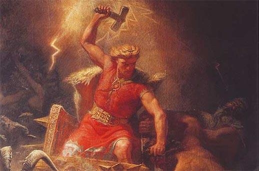 Тор-громовержец – это старший сын Одина, сильнейший из богов и людей и обладатель трех очень драгоценных вещей. Первая – молот, который и инеистые, и горные великаны знают по своему горькому опыту, когда они видят его брошенным против них в воздух, потому что он сокрушил много черепов их отцов и родственников. После броска молот сам возвращается Тору в руки. Вторая редкая вещь, которой он владеет, называется поясом силы. Когда он подпоясывается им, его божественная сила удваивается. Третья, также очень ценная вещь, – это его железные перчатки, которые он надевает всякий раз, когда должен эффективно пользоваться кулаками. От имени Тора произошло английское слово Thursday (четверг).