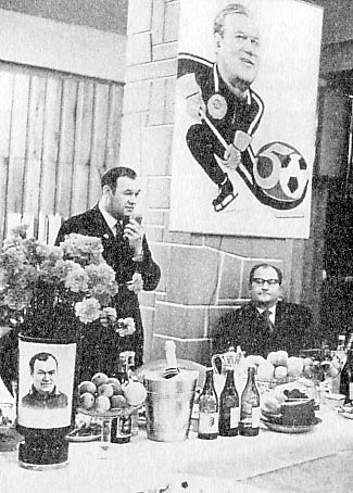 1973 г. В. Харламов, В. Лутченко, В. Петров, В. Бобров, Б. Михайлов, врач сборной команды СССР О. Белаковский, А. Волчков, Г. Цыганков, А. Рагулин, В. Третьяк и А. Гусев после приема у главного болельщика ЦСКА, министра обороны СССР А. Гречко.
