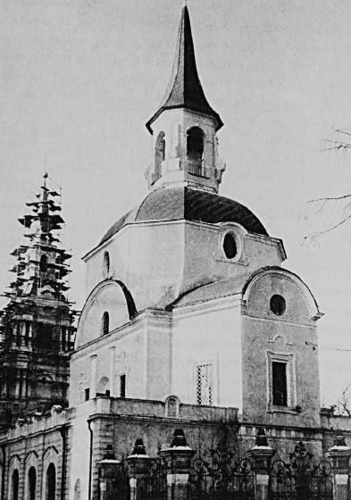 И. Зарудный (? — 1727). Церковь святых правоверных апостолов Петра и Павла на Новой Басманной улице. 1705–1728 гг.; колокольня 1745 г. арх. И. Мичурина, Фото 1980-х гг.