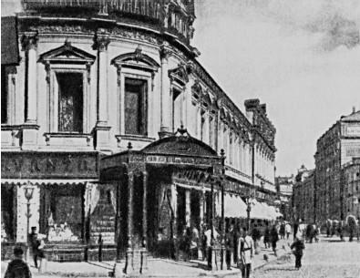 А. Розанов. Здание пассажа Поповых, затем Джамгаровых на Кузнецком мосту. 1877 г. Фрагмент. Фото 1994 г.