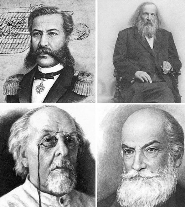 ( сверху-вниз, слева-направо)1. Можайский Александр Федорович— русский военный деятель, контр-адмирал,изобретатель, пионер авиации.2. Менделеев Дмитрий Иванович-русский ученый.3. Циолковский Константин Эдуардович-русский ученый, отец космонавтики.4. Жуковский Николай Егорович- русский механик, создатель аэродинамики , как науки.