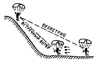 Наша "воздушная" скорость, как всегда, 35 км/ч. К этому надо добавить 15 км/ч скорости ветра, что делает скорость относительно земли равной 50 км/ч! Это довольно быстро, и мы можем покрыть значительный кусок земли за короткое время, летя с таким ветром. Наш угол глайдирования относительно земли также будет очень пологим: 50 км/ч — это примерно 14 м/сек, в то время как снижение остается равным 2 м/сек, т. е. угол глайдирования составляет 7:1. Но ПОСАДКИ С ВЕТРОМ нужно избежать любой ценой. При скорости 40 км/ч она слишком быстра и опасна. ВЗЛЕТАТЬ ВМЕСТЕ С ВЕТРОМ практически невозможно. Вы должны бежать со скоростью 15 км/ч, чтобы "нейтрализовать" ветер сзади и потом добавить еще 25 км/ч, чтобы взлетать, т. е. бежать нужно со скоростью 40 км/ч. Меньше, чем это значение, — и вы упадете во время взлета при очень высокой скорости относительно земли. ПОЛЕТ ПОПЕРЕК ВЕТРА со скоростью 35 км/ч добавляет боковой дрейф со скоростью 15 км/ч, и результирующая скорость относительно земли будет больше. В случае ПОСАДКИ ПОПЕРЕК ВЕТРА вы коснетесь земли на большей скорости, чем минимальная скорость, вызывающая схлопывание парашюта — 20 км/ч, и касание будет боковым, что рискованно.