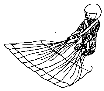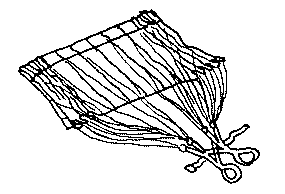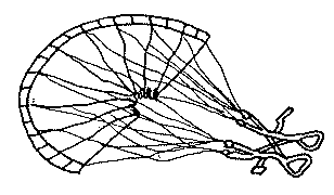 Подготовьте все ко взлету. Теперь, находясь в седле и липом вперед, не отсоединяйте управляющие петли от задних тяг. Вместо этого соберите обе правые тяги в правую руку, проведите их над головой и повернитесь кругом налево. Теперь к ветру обращена ваша спина, вы смотрите на купол, а тяги перекрещены прямо перед вами: