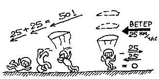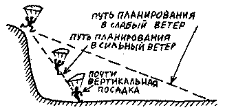 Боковой дрейф при полете поперек ветра будет теперь очень велик и угол полета окажется порядка 45°. Если вам хочется двигаться перпендикулярно ветру, вы должны ориентировать ваш парашют примерно под 45° на ветер, двигаясь по выбранному пути за счет. сноса ветром.