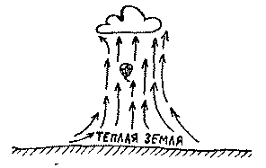 остается холоднее. Теплый воздух затем поднимается вверх или, как большой пузырь, или, как непрерывный поток, расширяясь и набирая скорость по мере подъема, и, иногда, отдает часть своей влага высоко над землей, образуя кучевые облака.